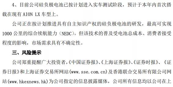 而长续航硅负极电池也按照计划进入实车测试阶段,预计今年内首次搭载在AION LX (配置|询价)上。