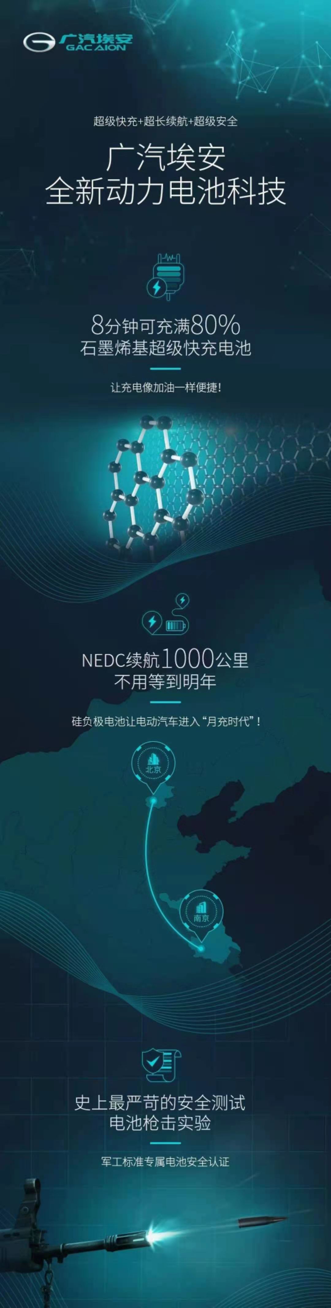 “广汽埃安将通过石墨烯基电池超级快充技术和硅负极电池1000km续航,解决续航顾虑,预计今年下半年可实现逐步量产,不要把技术突破和商业推广混为一谈。”