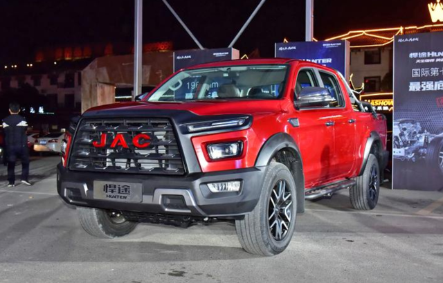 从外观来看,新车有一副高大威猛的姿态,前脸采用超大面积的倒梯形前进气格栅,内置了四条横置式镀铬饰条,搭配红色的“JAC”品牌标识,整体辨识度非常高。