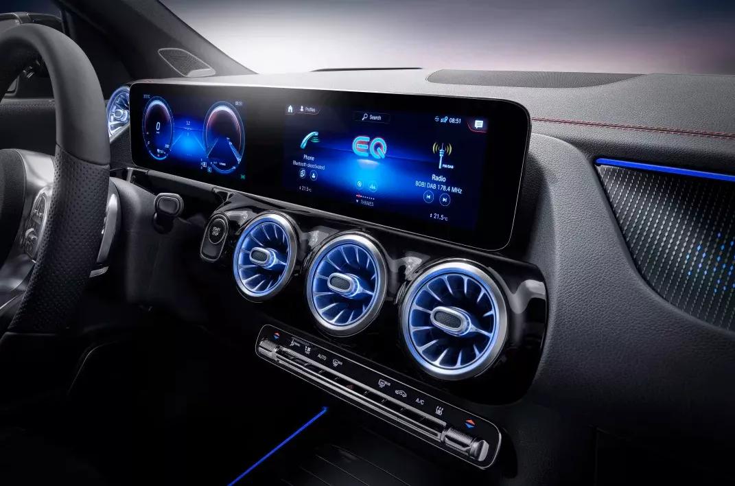 内饰则沿用了GLA那套,相信多数人都会喜欢的,关键是,这套内饰也能完美适配电动车的风格。为了强调科技感,EQA的内饰首次应用了背光饰板。它位于副驾正前方,相信能给乘客更加愉悦的感受。