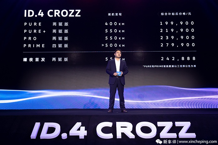 日前,一汽-大众ID.4 CROZZ (配置|询价)正式上市,ID.4 CROZZ 一共有五个车型,补贴后售价区间为19.99-27.99万元。ID.4 CROZZ推出了标准续航、长续航和高性能PRIME三个版本车型,除了高性能版采用双电机四驱外,其余版本均为后置后驱。电池组上,新车会提供55kWh和83kWh两种容量可选,其中83kWh的后驱版车型续航550公里,高性能PRIME版大于500公里,入门标准续航版采用55kWh容量电池,续航400公里。