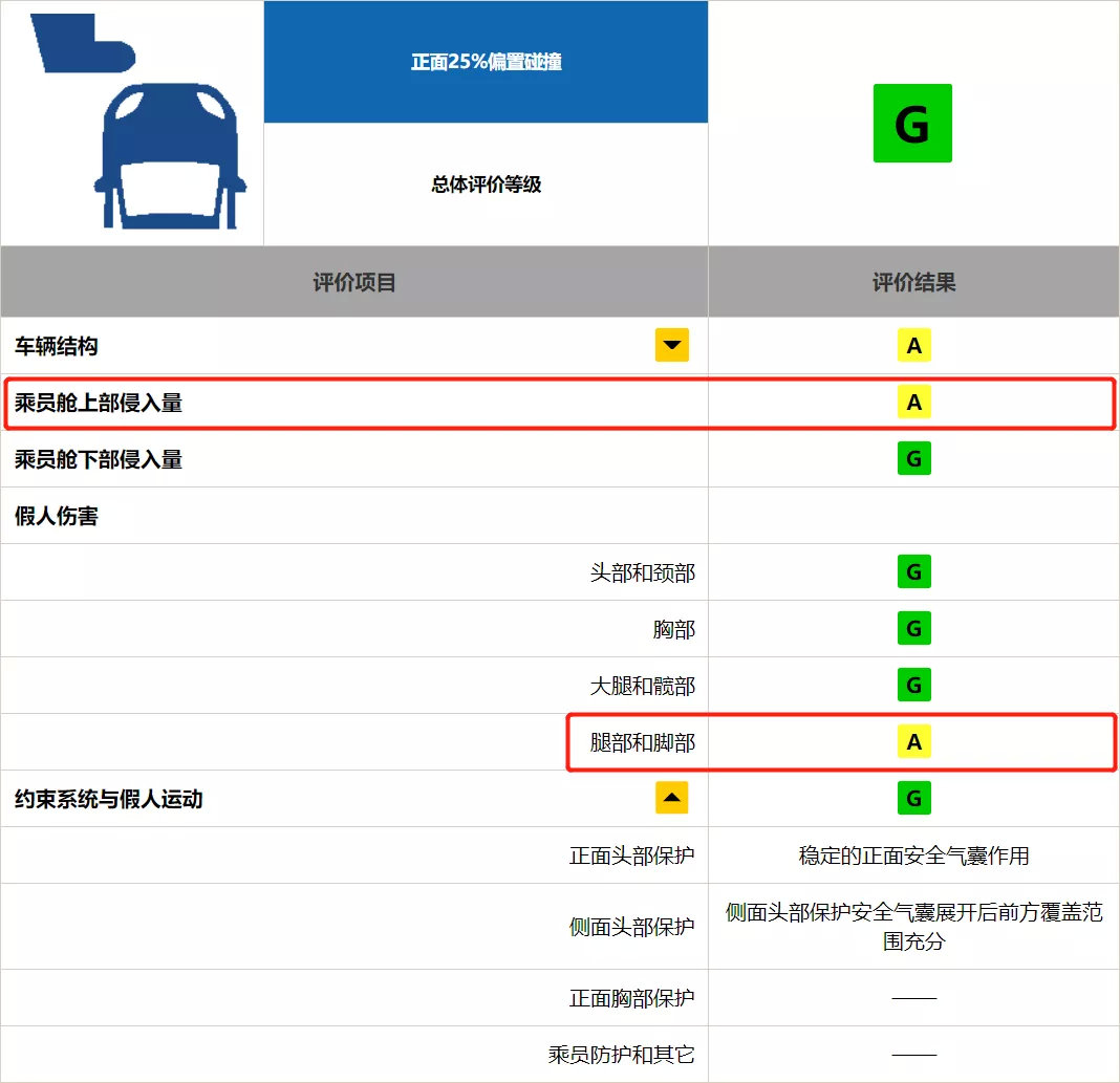 在大家最为关注的正面25%偏置碰撞中,奥迪Q5L总评分获得了G(优秀)的评价,表现符合预期,但是通过单项细分来看,Q5L还是存在一些小问题的。例如乘员舱上部结构有一定入侵,驾驶员的脚部和腿部也受到了一些伤害,这两项的评分只拿到了A(良好)。