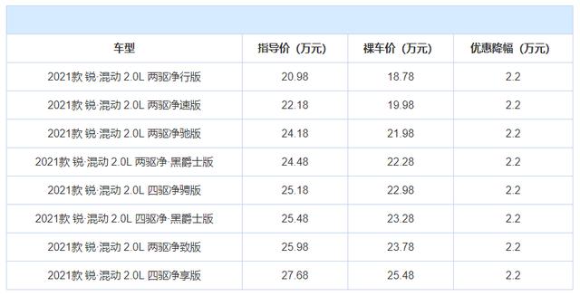 最高优惠幅度:2.2万元(锐·混动车型)