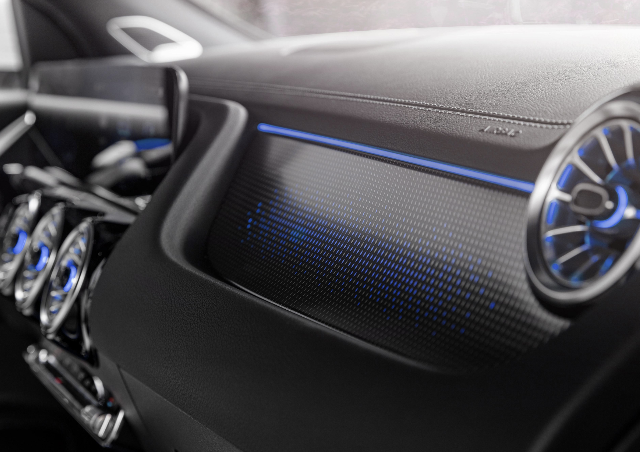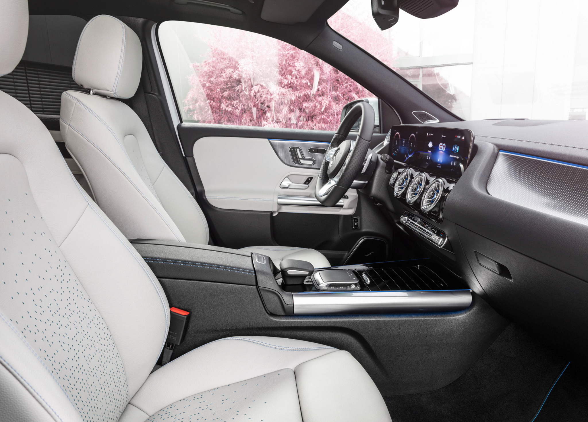 内饰方面,相比GLA车内源自奔驰品牌的豪华、庄重,EQA在保留真皮包裹和缝线工艺等豪华元素之余,还首次引入了副驾侧背光饰板设计。