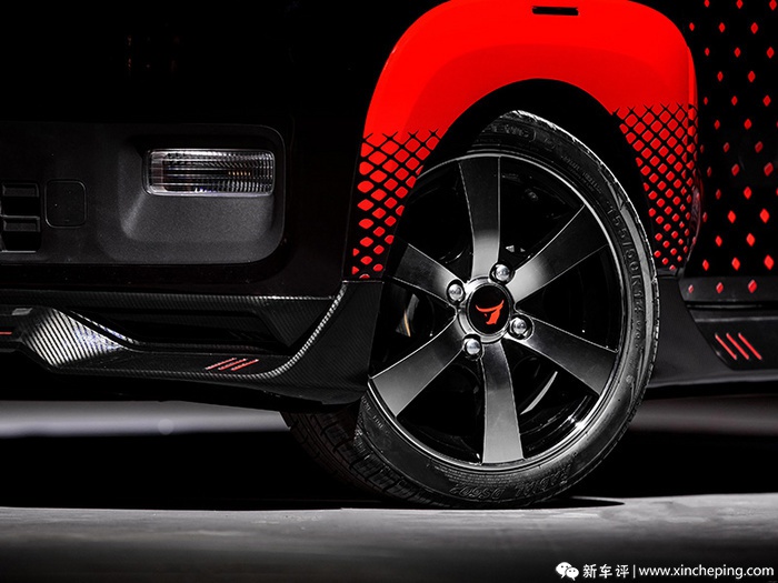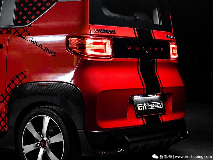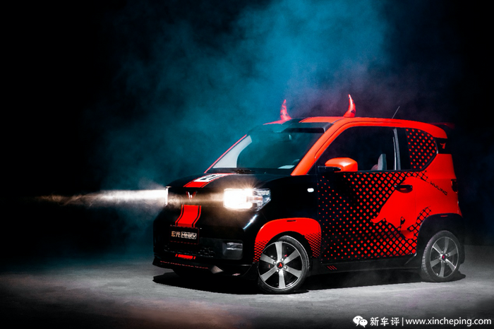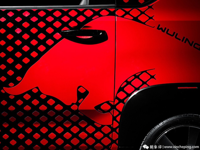 来看回发牛年纪念版,它采用红黑配色,车顶不忘插上牛角,寓意牛气冲天,很有中国传统美好祝福风味——牛年更“牛”。侧面利用颜色渐变植入牛的图案,整个设计过渡自然,搭配协调,设计功力相当到位。最后,改装方案的设计者还不忘给这台车配上六辐式哑光黑的轮圈、红色卡钳和牛气冲天的尾翼。目前五菱并没有展示这台车的内饰设计部分,这台车或涉及合规问题,不会上市销售。