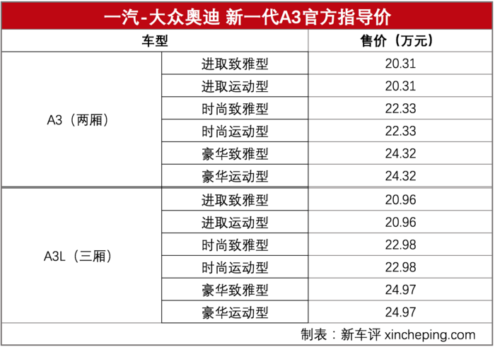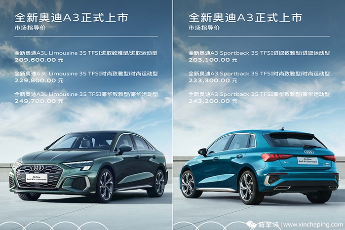 1月23日,一汽-大众奥迪宣布全新A3/A3L正式上市,售价区间20.31-24.97万元,目前部分新车已到全国各地店头。具体车型分布方面,全新A3分两厢三厢各推6款车型,三种配置级别 X 两种设计风格,全系搭载1.4T发动机,并且为了彰显其MQB-Evo平台出身的数字化优势,全系标配数字仪表盘和中控大屏,提供数字座舱体验。