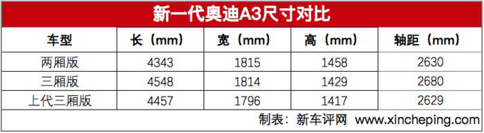 全新奥迪A3 (配置|询价)在设计上向全新家族化风格看齐,摒弃老款车型圆润饱满的造型,更强调线条的力量感和切面的立体感,中网六边型大嘴得到修饰后强化了视觉冲击力。变得更宽更扁,全新奥迪A3三厢有小A4 (配置|询价)的观感,向上靠思路应该很受目标用户的欢迎。尺寸方面,较上一代有所提升,详细看下表: