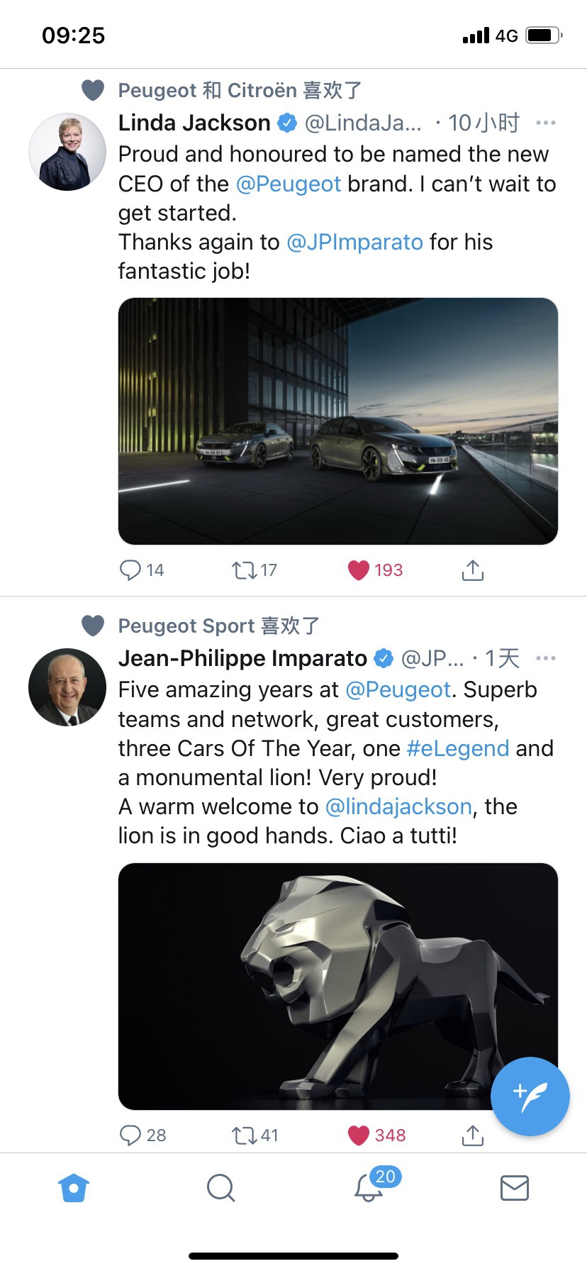 “在标致汽车公司度过了精彩的五年。精湛的团队和人脉,庞大的客户,三辆(欧洲)年度汽车,一辆eLegend(概念车)和一头巨大的狮子!非常荣幸!热烈欢迎@LindaJackson,狮子在您身边。”