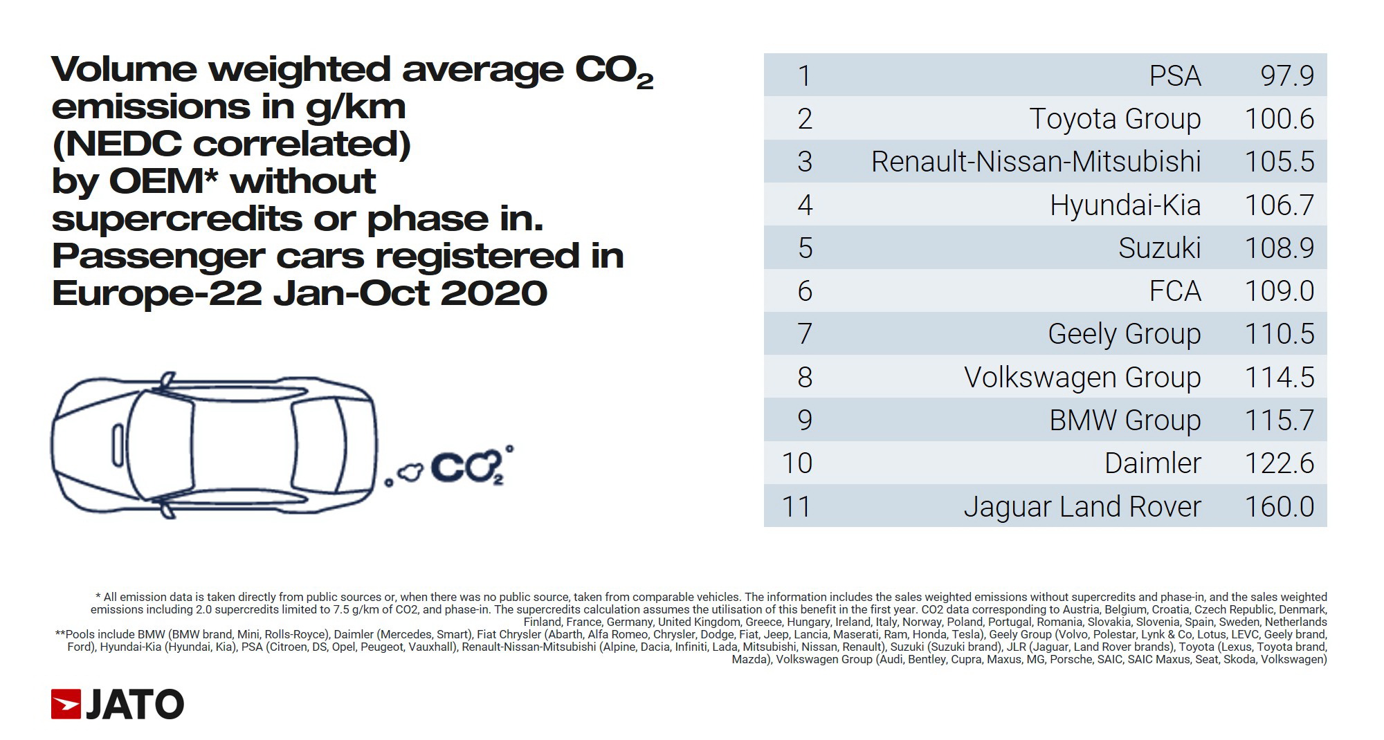 来自JATO的数据显示,在过去的2020年,PSA集团在欧洲主机厂中低碳排放的数据位列第一:平均97.9g/km。第二名是丰田汽车集团:平均100.6g/km;第三名则是RNMA(雷诺-日产-三菱联盟):平均105.6g/km。