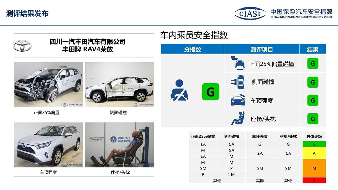 丰田荣放在耐撞性与维修经济性方面得到了M一般的评价,除此之外,在车内乘员项目中,25%偏置碰撞测试、侧面碰撞测试、顶压测试、座椅/头枕测试以及整体评价方面,丰田荣放都得到G优秀的评价。此外,在车外行人保护和辅助安全项目中,丰田荣放也都得到了G优秀的评价。