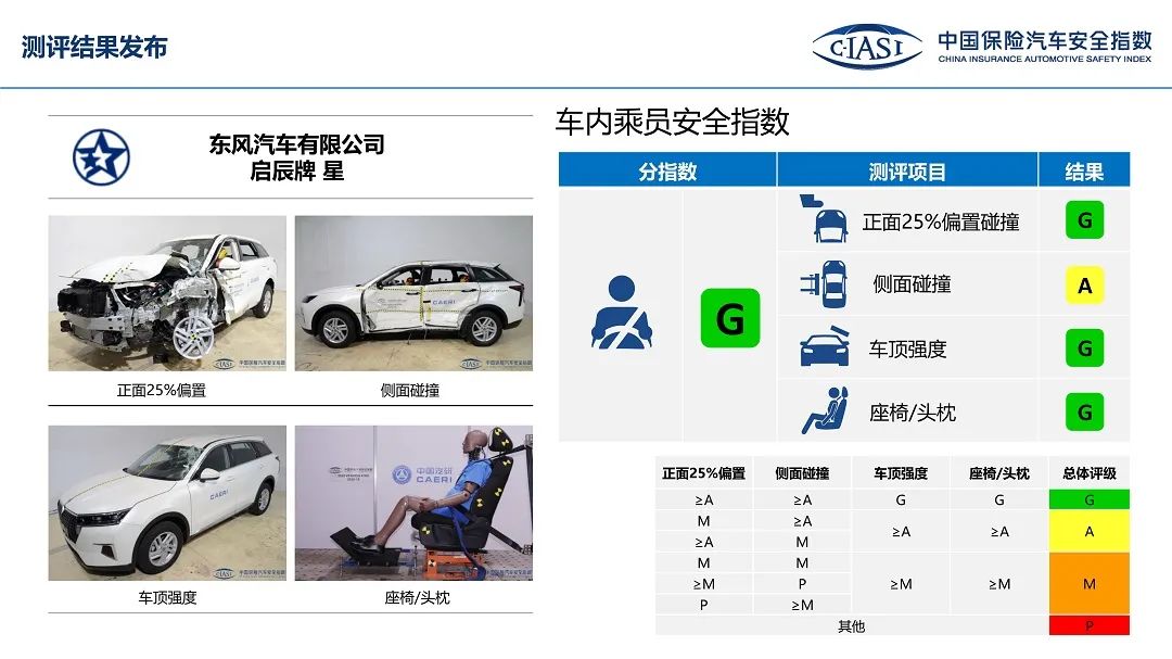启辰星在耐撞性与维修经济性方面得到了M一般的评价,在车内乘员项目中,25%偏置碰撞测试中得到了G优秀的评价,但是在侧面碰撞中却得到了A良好的评价,而顶压测试和座椅/头枕测试中都得到了G优秀的评价,所以整体评价也得到了G优秀。在车外行人保护和辅助安全方面也得到了G优秀的评价。