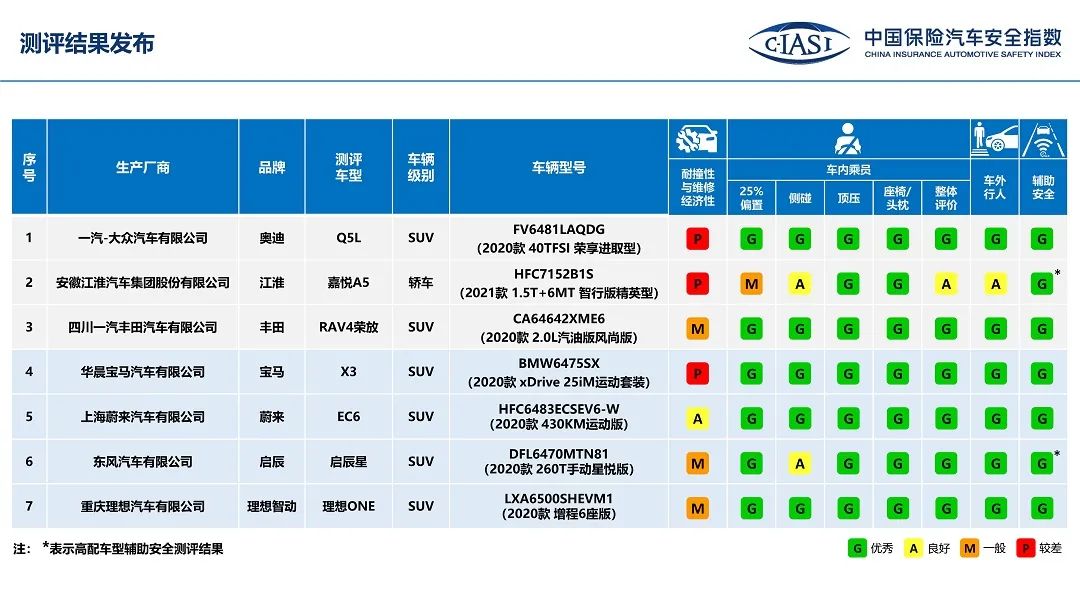 1月21日,中保研(C-IASI)公布了2021年首批车型碰撞结果,包括一汽-大众奥迪Q5L (配置|询价)、江淮嘉悦A5、一汽丰田RAV4荣放 (配置|询价)、华晨宝马X3、蔚来EC6 (配置|询价)、东风启辰星和理想ONE。