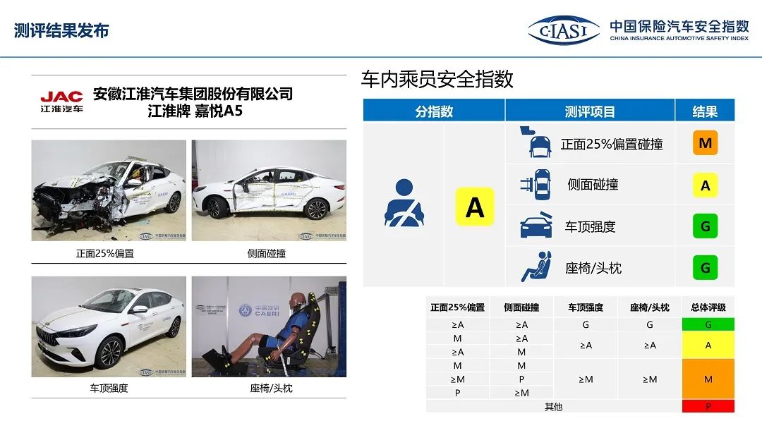 而江淮嘉悦A5在侧面碰撞测试的表现也只得到了A良好的评价。在顶压测试和座椅/头枕测试中都得到了G优秀的成绩,但是由于25%偏置碰撞测试和侧面碰撞测试表现不佳,江淮嘉悦A5在车内成员整体评价上得到了A良好的评价。此外,在车外行人保护项目得到了A良好的评价,在辅助安全项目上得到了G优秀的评价。