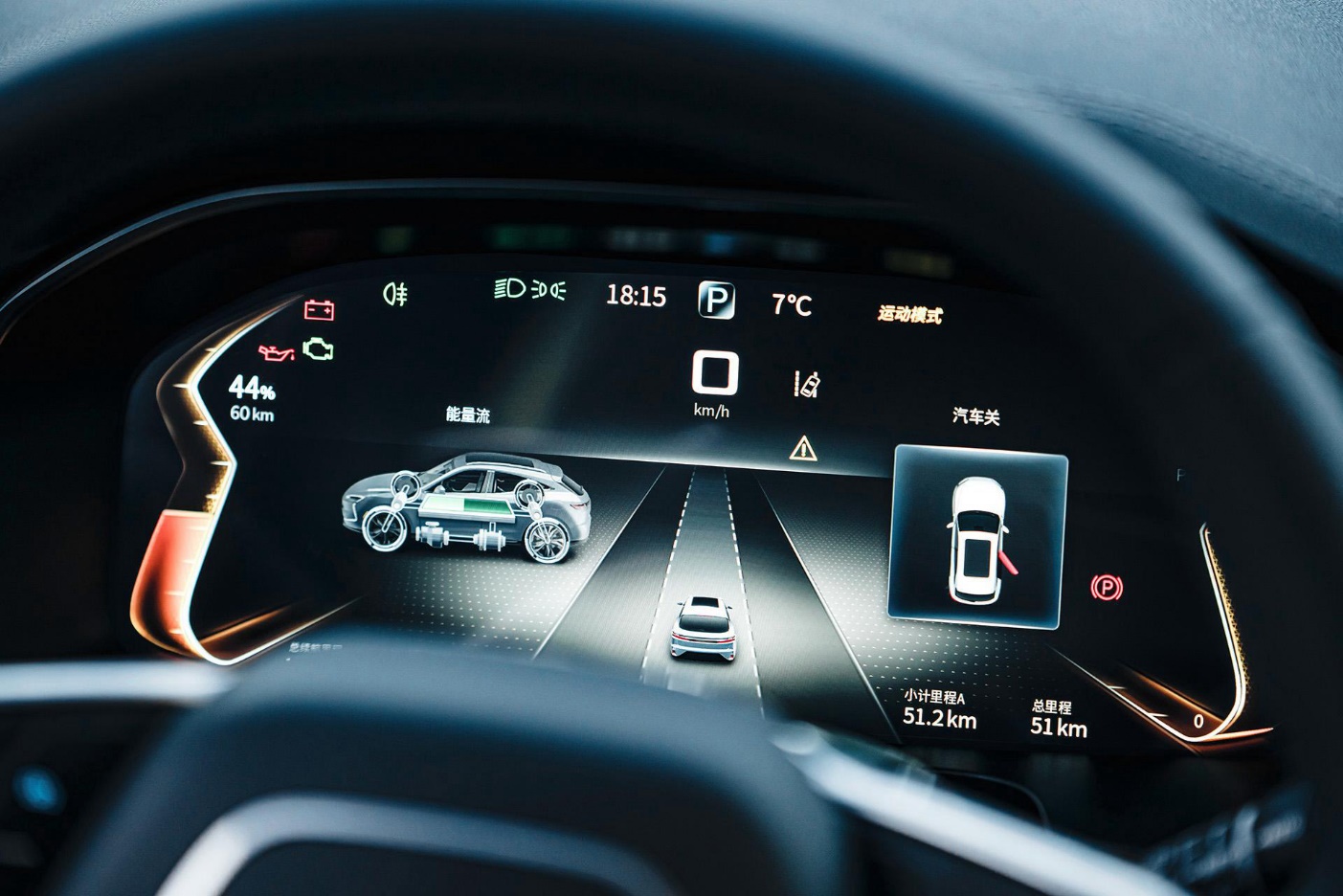 配备了12.3英寸全液晶仪表盘,显示信息也比较丰富直观,能够显示剩余电量、动力输出、驾驶辅助模拟、多媒体信息以及导航等等。