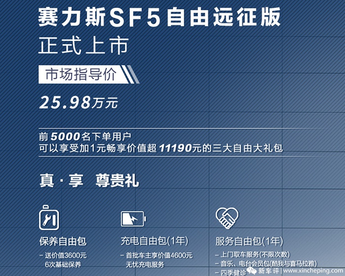 1月25日,2021赛力斯STC技术大会在线上举办,发布会上,赛力斯联合华为发布了DriveONE三合一驱动系统的第二代增程系统,同时,赛力斯SF5自由远征版车型也正式上市,售价为25.98万元。