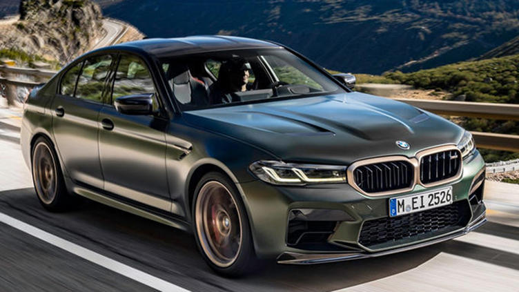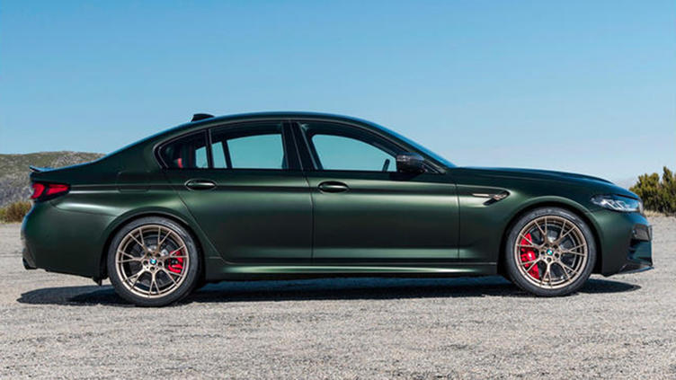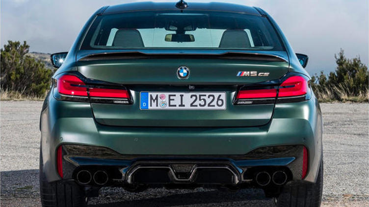 宝马新款M5 CS采用了哑光军绿色和金色的车身配色,前脸依旧采用了经典双肾进气格栅设计,车头两侧装配了激光大灯组,格栅上方还加装了M5 CS车型专属LOGO。车身侧面配备了多辐式铝合金轮毂,内部还提供了宝马MP高性能刹车卡钳,门框饰条也进行了黑化处理。车尾为双边双出式排气布局,尾门上方还加装了宝马MP碳纤维材质打造的小尺寸尾翼。