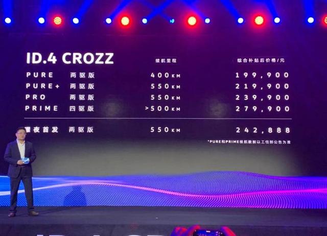 ID.4 CROZZ一共推出了五款车型,续航从400KM到550KM不等,分单电机与双电机两个版本,补贴后售价19.99-27.99万元,这个价格不算高但也不便宜,尤其是和国产纯电车型以及特斯拉相比完全没有优势所言,除了大众车标和EMB平台的光环外,几乎没有任何亮点。