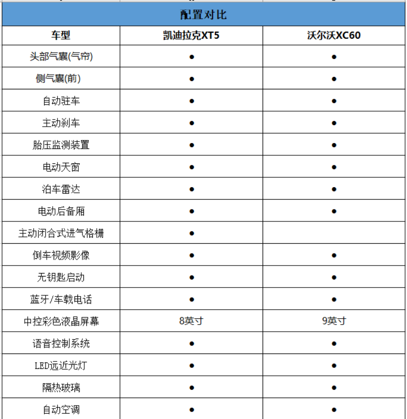 此次我们拿了两款车型的入门版进行对比分别是,2021款凯迪拉克XT5 28T 技术型和2021款沃尔沃XC60 T4 智行豪华版,可以看到像一些常用配置均有配备,而XC60则是多了一些安全方面配置,符合其品牌定位;XT5则是多出了一些舒适性配置,也同样符合其美式车的定位。
