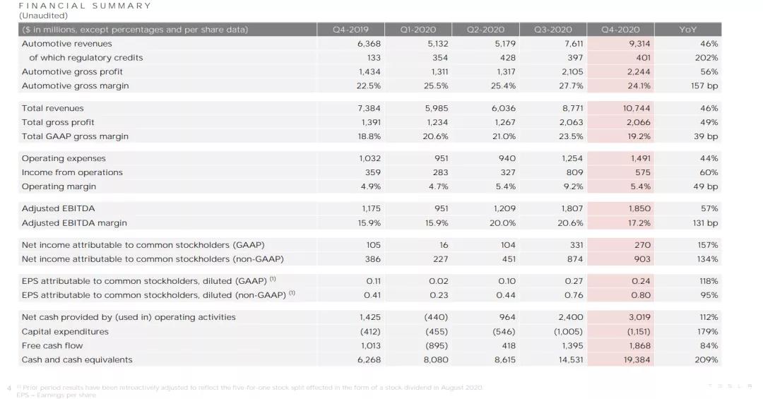 昨日,特斯拉公布了2020年的销量数据。其中显示,2020年第四季度,总营收为107.44亿美元,同比去年增长46%。全年减去资本支出后的营运现金流(自由现金流)达28亿美元,全年营业利润率达到了行业较领先的6.3%,已连续六个季度实现盈利。
