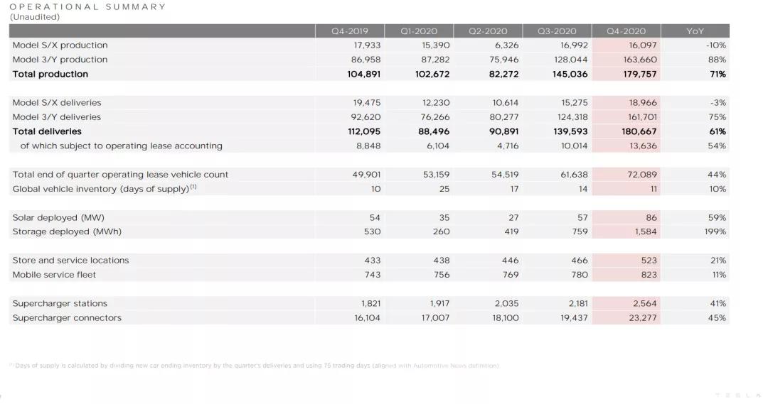 交付方面,2020年第四季度,总交付量为180667辆,其中Model S和Model X车型交付18966辆,Model 3和Model Y (配置|询价)车型交付161701辆。2020年总交付量为499647辆,非常接近全年50万辆的交付目标。官方预计,接下来的几年中,车辆交付的年均增长率会达到50%。另外,2021年底,还将交付第一辆Semi半挂卡车。