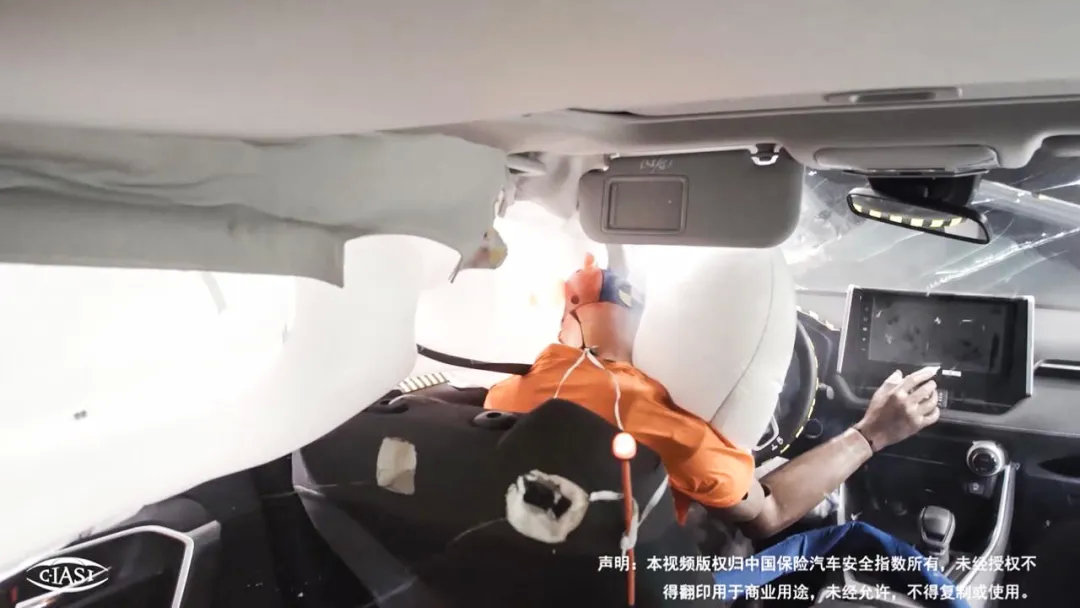 从车内视角可以看到,在发生25%碰撞后,RAV4的正面气囊以及气帘正常展开,配合安全带系统有效地保护了假人,从这个角度也再次说明,侧气帘对于假人的安全性是十分重要的,而RAV4全系标配了7个气囊以及气帘,值得肯定。