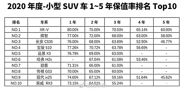 查阅中国汽车流通协会刚刚发布的《2020年度中国汽车保值率报告》,我们可以发现,XR-V以70.5%的三年保值率夺得同级车型中“最保值”车型。