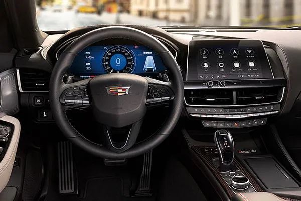 内饰方面,运动感也十分强烈,方向盘上配备了换挡拨片,增加了驾驶体验感,同时在中控区域以及副驾驶仪表等处均使用了碳纤维材质,看上去就充满激情。此外,10英寸中控屏车机内置全新一代凯迪拉克移动互联体验 CUE和无线CarPlay以及百度智能语音交互系统。