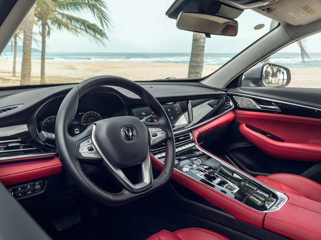 新车采用环抱式座舱设计,黑色与红色的撞色设计更加冲击了视觉感受。并且,12.3英寸的中控屏车机内置了梧桐车联TINNOVE系统,更加突显了内部的科技感。