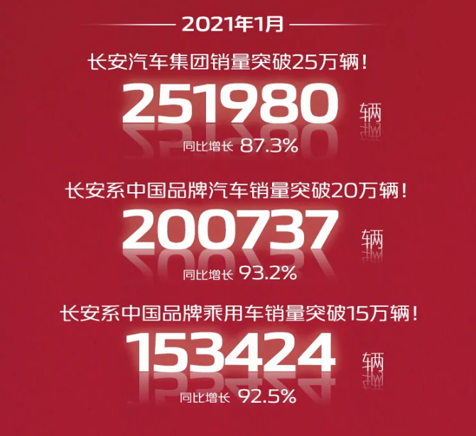 果不其然,最新的一月份销量数据显示,长安汽车集团2021年首月累计销售达251,980辆,同比增长87.3%,取得了新一年的开门红。