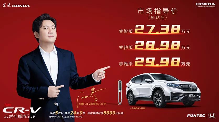 至于价格大家先看这张图,CR-V锐·混动e+一共推出三款车型,补贴后指导价27.38-29.98万。价格贵不贵,我们后面说,但从东风本田邀请沈腾这位最近几年红得比煮熟的小龙虾还红的明星宣传来看,东风本田肯定是非常看重这款车型的上市。