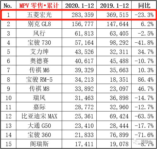 2020年,受市场大环境影响,MPV车型的热度较往年有所降低,不过这丝毫也没有动摇五菱宏光车系在MPV车型中"销冠"的位置。