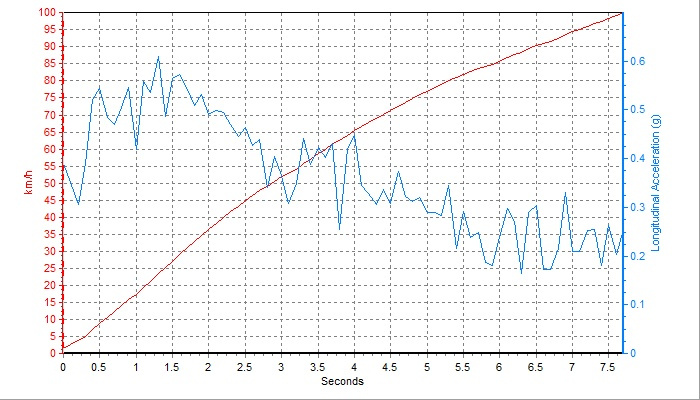 可以看到在0.5s后,G值开始逐渐攀升,最高在1.3s左右达到0.6G,此时给到驾驶员的推背感亦是最强的。除此之外在整个加速过程中,变速箱的动力衔接梳理得非常畅顺,虽然加速的韵律感比较一般,但驾驶员还是能感觉到一定动感,最终做出的最佳百公里加速为7.69s。作为参考,同款动力总成的领克05 (配置|询价)做出的百公里加速成绩为8.44s(气温30°C、地温43.1°c)
