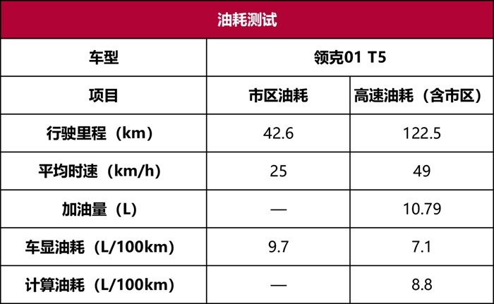 本次油耗测试,新款领克01在平均时速25km/h的情况下,做出了的市区表显油耗为9.7L/100km,这个表现只能说一般;而高速综合油耗表显为7.1L/100km,但实算却为8.8L/100km,结合实际考虑和以往的其他领克车型(例如同款动力的05,实算也在7.1L左右),所以高速油耗按7L左右去预估,属于正常。