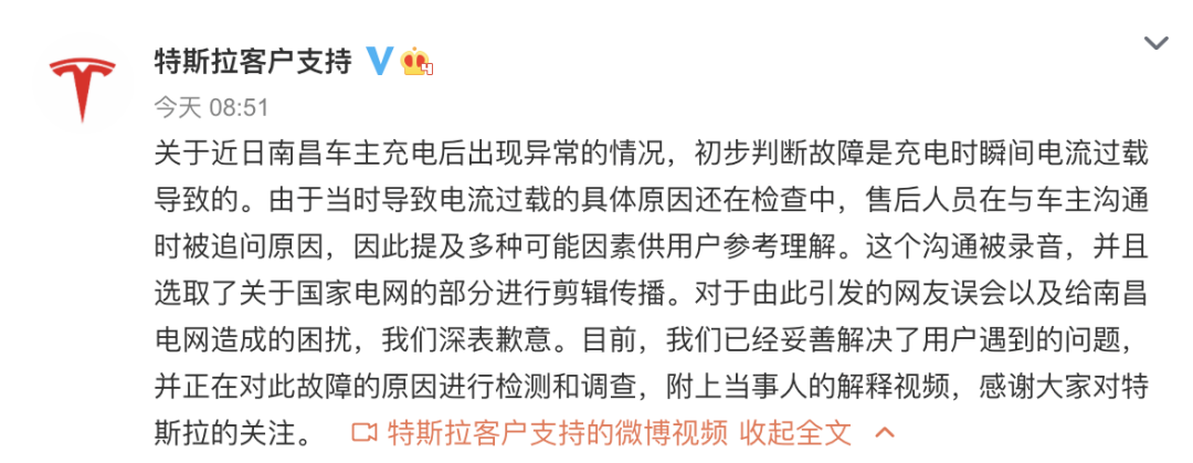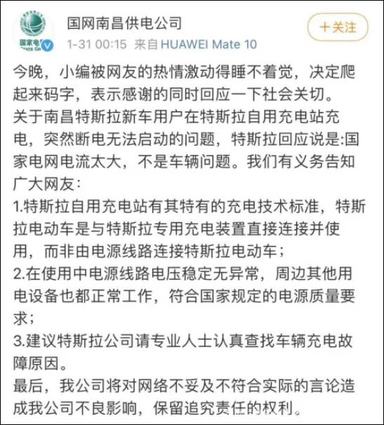 事情至此还只是商家与顾客之间的纠纷,可特斯拉将逆变器被烧原因“甩锅”给国家电网,称新车断电原因是由于充电瞬间电流过载所导致,所以并不是车辆本身问题。对于特斯拉售后人员指国家电网电流太大致车辆损毁的说法,1月31凌晨,国网南昌供电公司迅速发文回应。