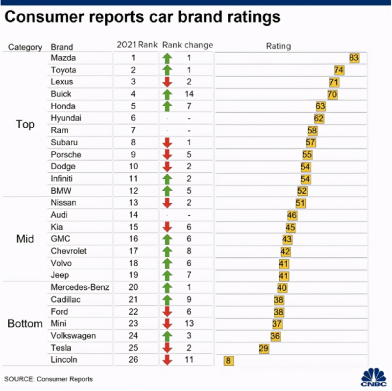《消费者报告》公布汽车可靠性排行榜,特斯拉“荣获倒数第二”。