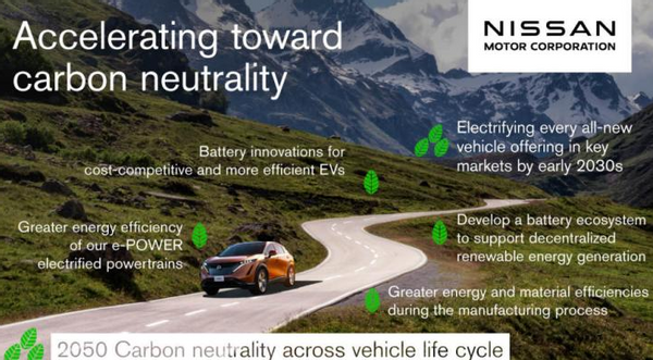 日前,天天汽车获悉,日产汽车公司发布了碳中和目标,希望集团在2050年实现产品生命周期和企业运营的碳中和,计划在2030年初步实现核心市场新车型的完全电动化。
