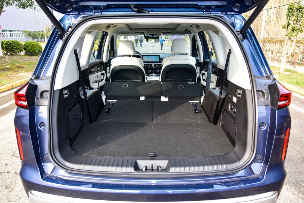 揽月的长宽高分别为4970mm、1940mm、1788mm,轴距为2900mm。越级的车身尺寸为了揽月提供了充足的车内空间,因此采用2+3+2的座椅布局对它而言并不算难事。值得一提的是,揽月的后两排座椅放倒后很纯平,可以将车内空间最大化的利用起来。