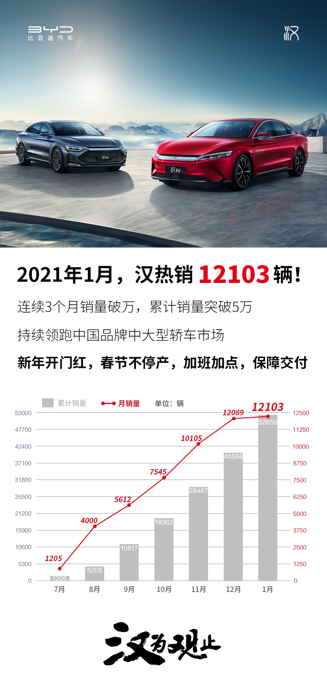 在2021开年之际,汉强势出击,再次收获破万佳绩,成为中大型轿车市场唯一一款月销破万的新能源车,不断刷新市场和品牌新高度,为中国高端新能源汽车市场树立更高的行业标准。未来,汉还将在产品、服务等多方面不断发力,持续为品牌发展注入新动能,为用户带来超越期待的出行体验。