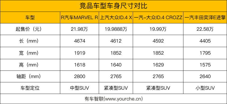 MARVEL R的第二类竞争对手,在我看来是诸如大众ID.4 (配置|询价)、一汽丰田奕泽E进擎之类的热门合资纯电SUV。首先售价方面,有一定程度重合,25万元上述的三款车型都可以买到,与它们相比,MARVEL R最大的优势是车身尺寸。