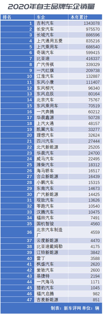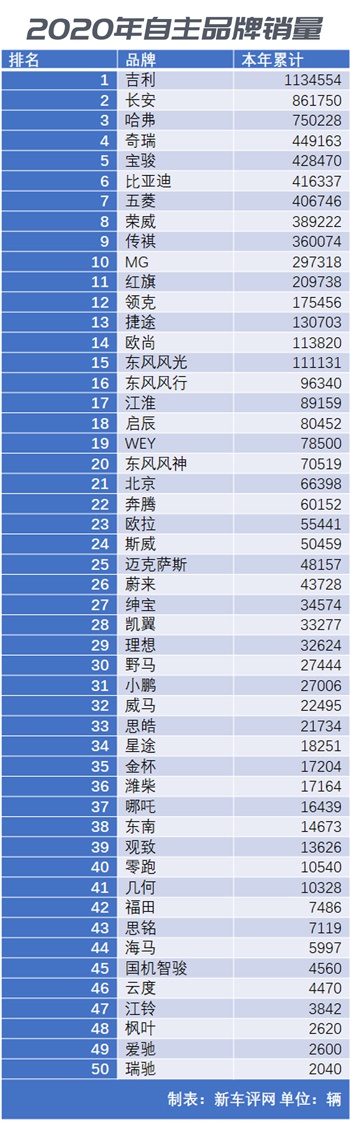 头部占据大份额之后,二三线自主品牌生存就更加艰难了,市场挤压效应明显。2020年自主品牌车企年销量不足十万辆车企占了约75%,所以在2021年势必还有不少没技术、没产品的车企消失于视野当中,笔者不敢妄自猜测,但从车企销量排行榜从下往上看,各位看官也心中有数。
