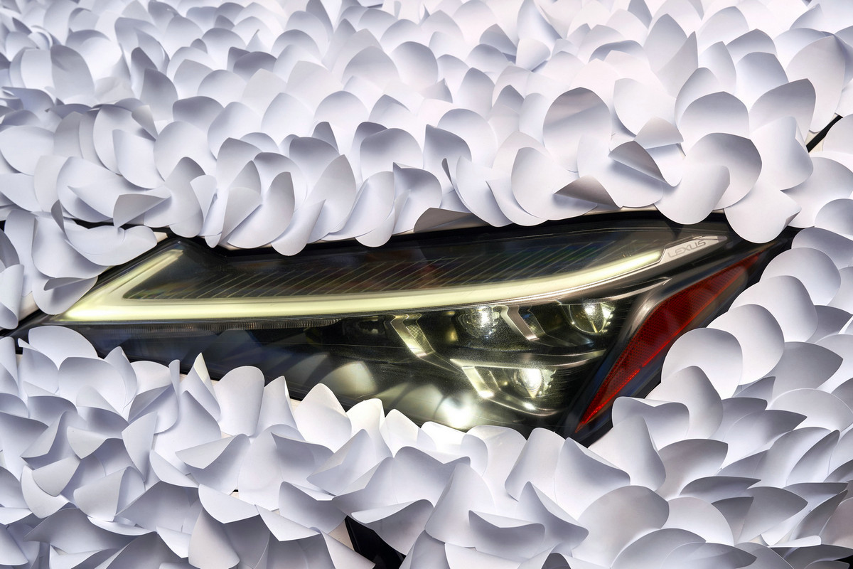 Montagud说:"我们使用了日本文化中的重要元素,那就是纸,以雷克萨斯植被的形式覆盖在汽车的外部,赋予它体积。光是日本艺术和设计的另一个重要品质,在这里,它将雷克萨斯US变成了一个有生命的东西。根据光线的位置、色调和强度,它在一天中产生不断变化的质感和色彩。"