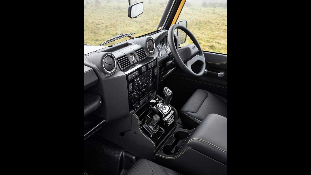 外观方面,新车采用“Eastnor Yellow”颜色作为车漆主色调,两侧圆形大灯看上去极具硬派气息,同时,在车顶上方还增加了行李架和四组高位射灯,在夜晚点亮后可以提供更广的照射范围。并且,两侧微微外凸的黑色轮眉也增加了整车的视觉宽度,看上去更加具有野性。