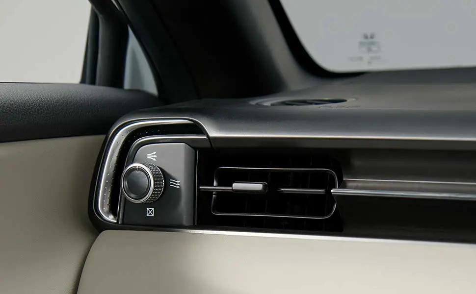 它左右两边的空调出风口,还各有一个副出风口,可用开关调节,它能沿着车门吹出微风,据官方说能增加舒适性,也能更好地隔绝窗外的热量。好不好用,等到时体验再说,但我挺喜欢这个小细节的。