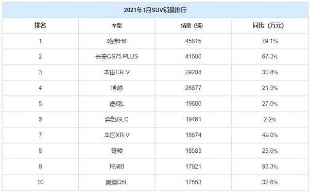 具体来看,哈弗H6在1月销量为45815辆,依旧稳稳占据SUV销量榜的第一名。