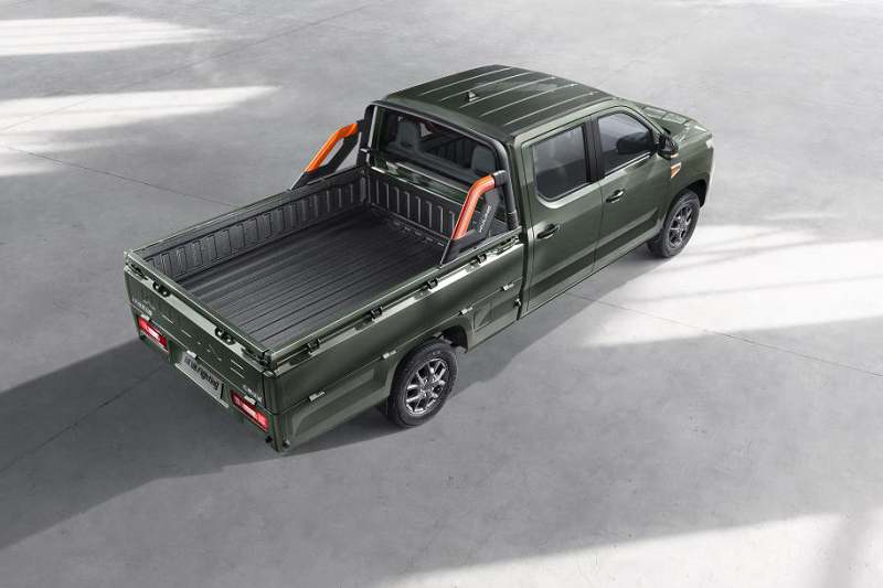 车身侧面,新车整体造型十分修长,采用标准的双排座皮卡车身布局。其中新车采用多组平直线条勾勒车身,再搭配上梯形前后轮拱,以及融入其中的黑色涂装双五辐轮圈,为整车带来了很好的力量感。车身尺寸方面,新车长宽高分别为5105/1640/1810mm,车宽选装窄脚踏板为1700mm,选装宽脚踏板1815mm,轴距为3160mm;货箱栏板内尺寸为2000/1520/365mm,箱面离地高度790mm。
