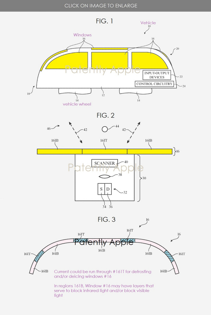 苹果的新一代车窗系统,配备加热和滤光组件,可阻挡红外光的滤光层,还有通电加热的导线,以实现除霜功能,另外部分车窗还会被涂上黑色的墨水,以防止外面人看到车内情况。为了让这么多的组件能够布局下去,苹果开发了一个多层结构车窗,车窗还具有外部结构层,据介绍包括介电薄膜、导电层、可阻挡红外线、可见光和/或紫外线的滤光层、墨水层以及用于调整车窗部分或全部外观的其它层、以及其他结构。这一系统还涉及利用光学组件,采用滤光片方式进行调节,满足不同场景的需求。