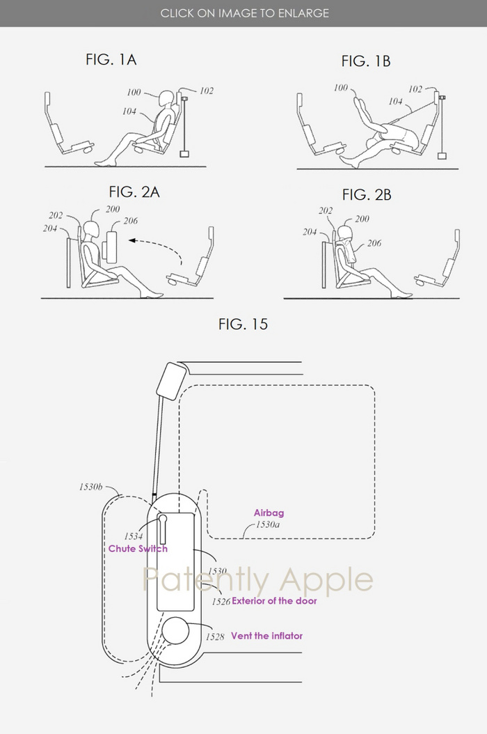 当汽车实现自动驾驶,包括驾驶员在内的乘员都不必盯着前方看,为了交谈互动方便,大概率会采用相对设置的座椅系统,因而需要一套重新设计的安全气囊系统。苹果设计的新安全气囊系统里,有座舱分隔器、动态座椅系统以及拉紧限制装置和充气限制装置等,这里面充气限制装置有系链的安全气囊、安全带以及安全腰带安全气囊、车顶和车门安全气囊等装备,在座椅相对设置、乘员面对面的车辆中,如果发生碰撞事故,能够提高安全性。