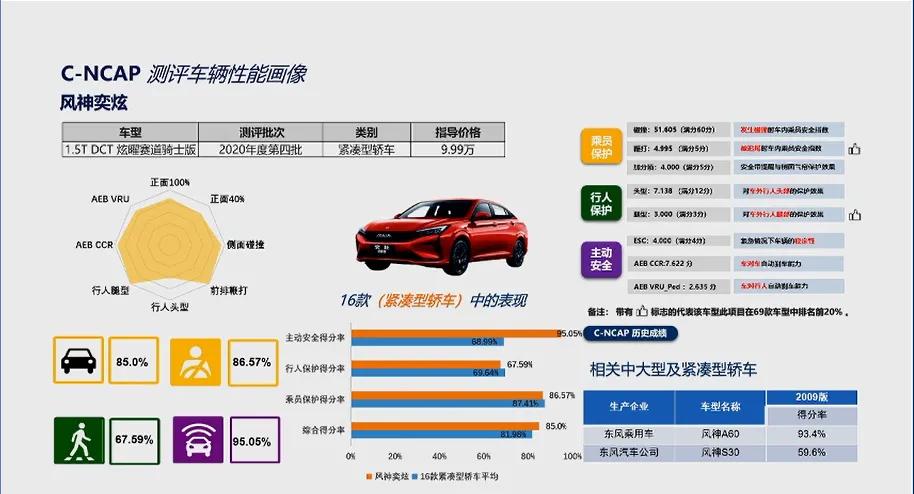 在本次碰撞测试中,东风风神奕炫获得了85.0%的综合综合得分率,虽然在本批碰撞车型中排名倒数第二,但刚好达到了C-NCAP的五星评级,据悉是目前8万级车型中唯一一款拿到五星评级的车型。其中,奕炫的乘员保护得分率和行人保护得分率较低,分别为86.57%和67.59%。不过,奕炫在主动安全为同批车型第二,得分率高达95.05%,可见,奕炫在安全辅助配置方面的水平还是很高的。
