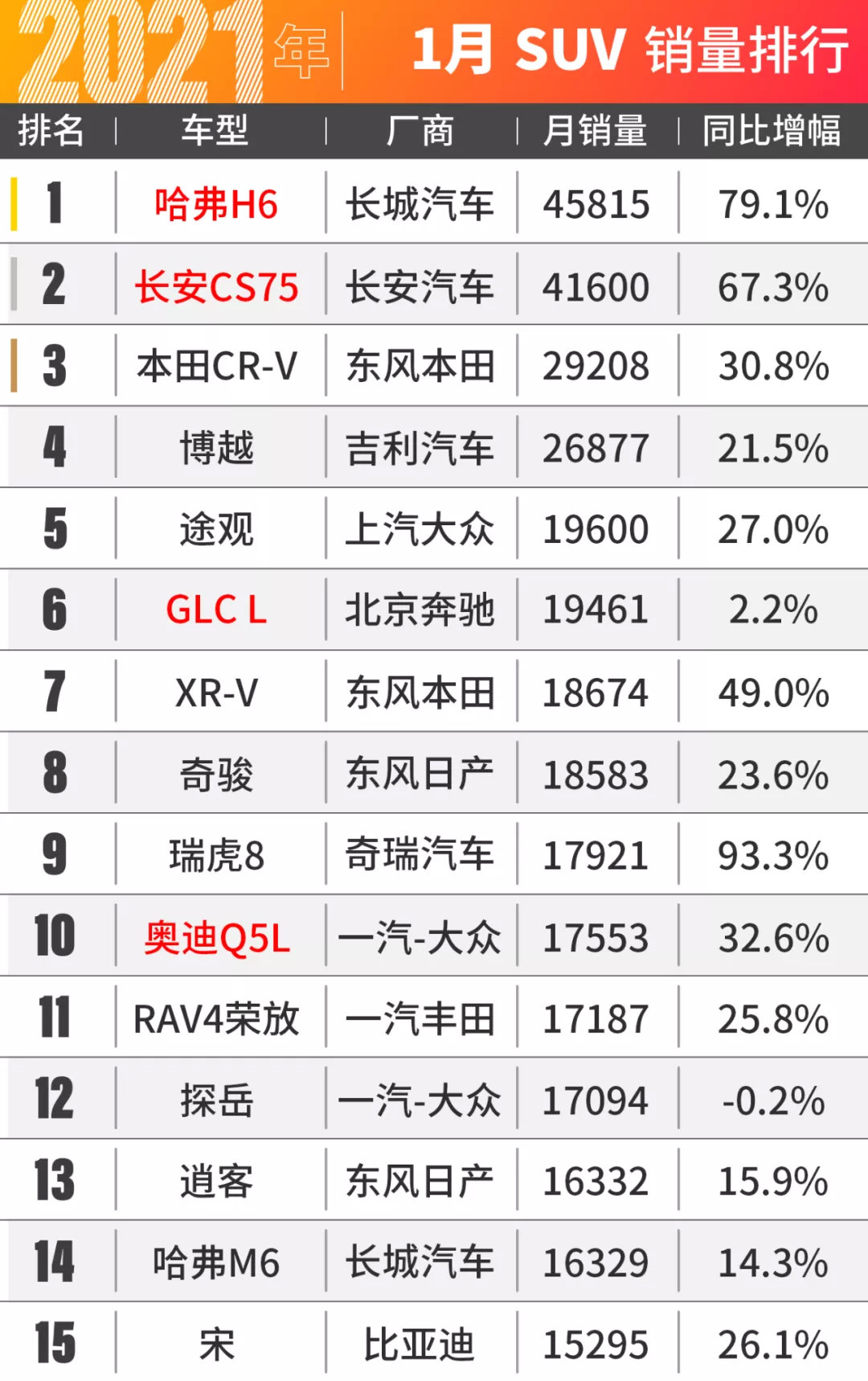 SUV市场依旧稳定,哈弗H6凭借45815台的销量继续蝉联冠军。只是这个老大的位置坐的并不安稳,身后的长安CS75在1月居然卖出了41600辆,与哈弗H6只剩下4000台的差距了!