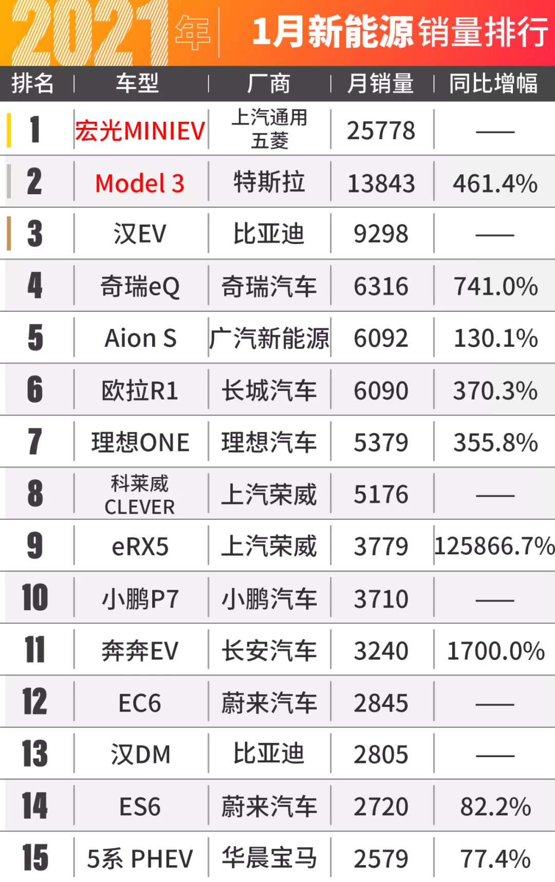 特斯拉Model 3在1月也出现了下滑,从12月的23804台下滑到了13843台,降幅同样高达1万台!尽管如此,凭借着较大的基数,Model 3依然是中国市场销量最高的新能源三厢轿车。值得一提的是,如今特斯拉Mode Y已经国产,1月份开始陆续交付,或许到下个月的2月销量排行榜上,咱们就能看到Model Y的身影了!